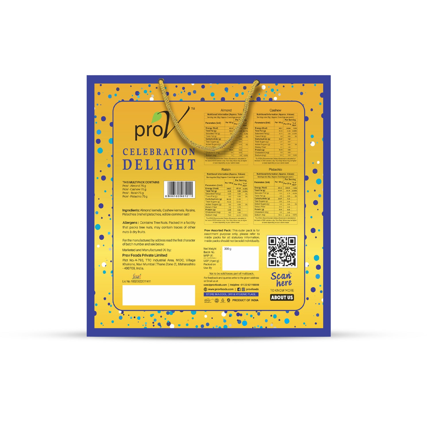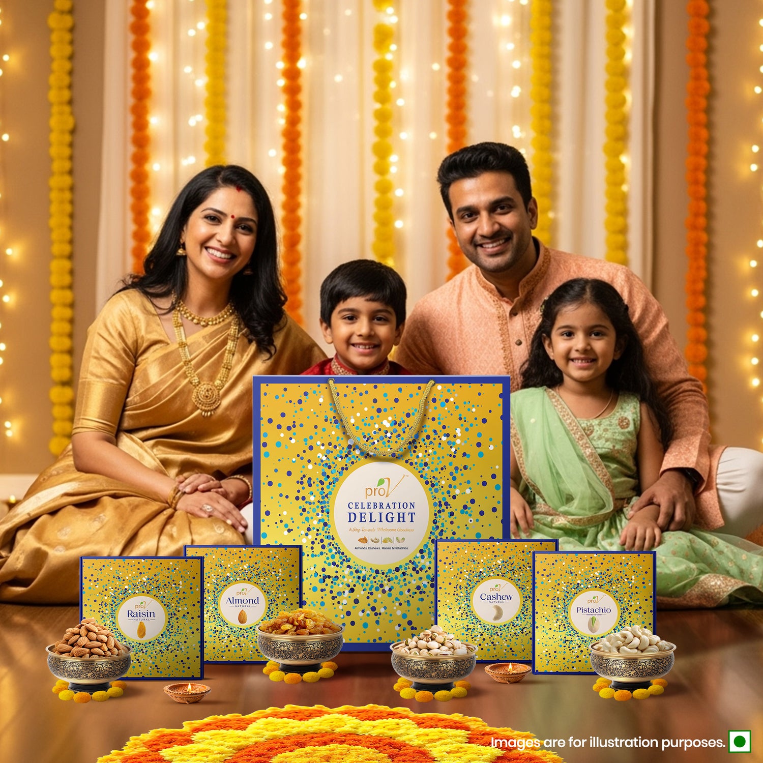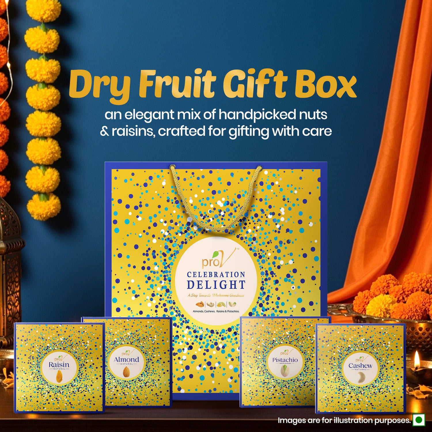 ProV Celebration Delight 300g gives you a thoughtfully curated assortment of almonds, cashews, raisins, and roasted & salted pistachios in premium packaging—at a price that’s affordable for every celebration.