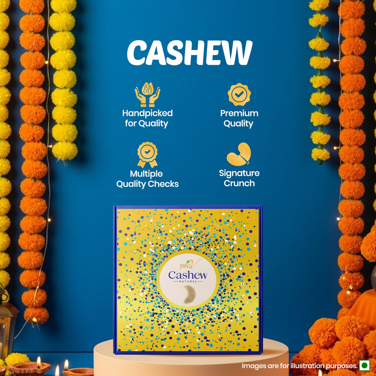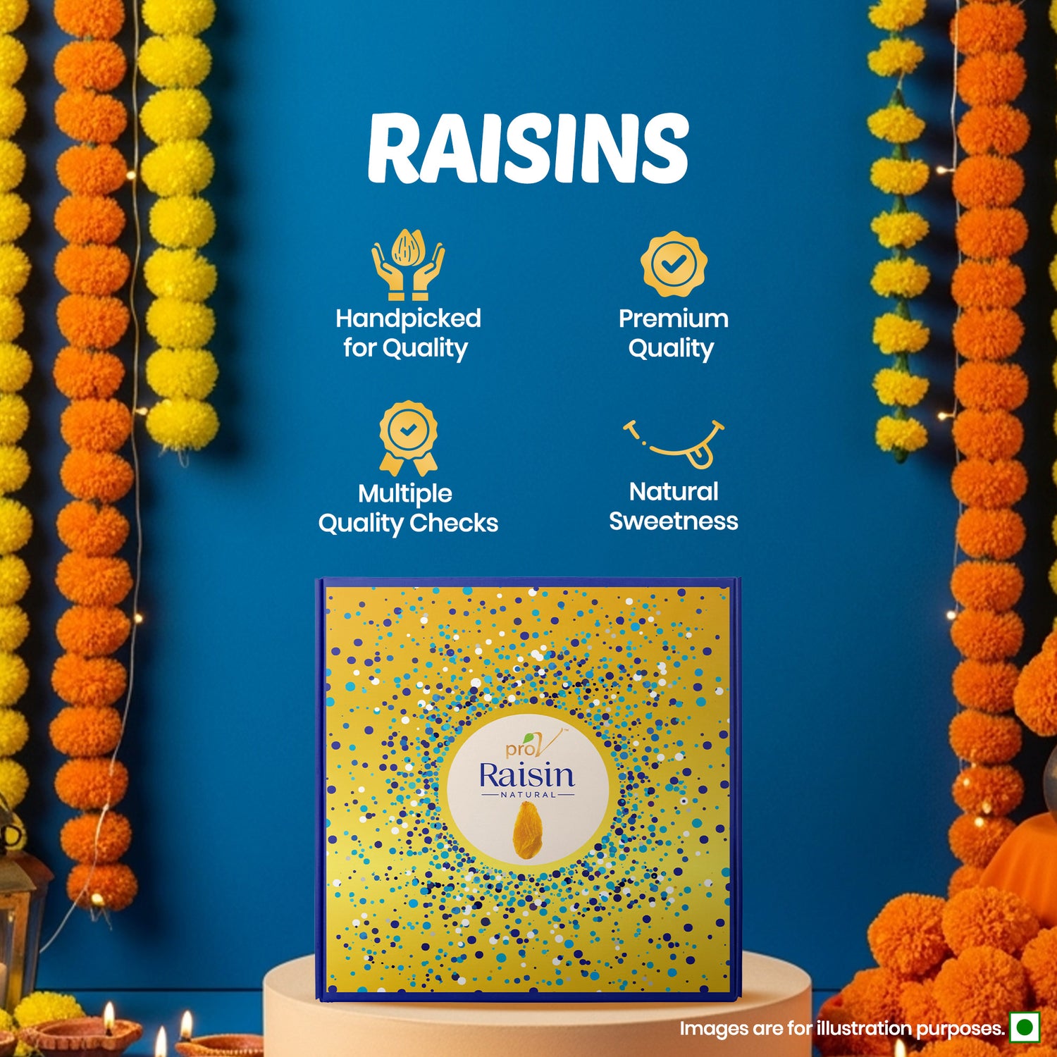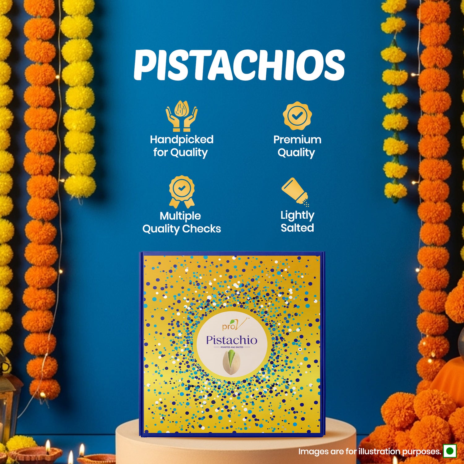 ProV Celebration Delight 300g gives you a thoughtfully curated assortment of almonds, cashews, raisins, and roasted & salted pistachios in premium packaging—at a price that’s affordable for every celebration.