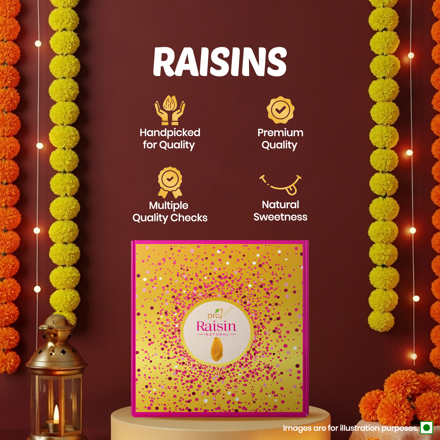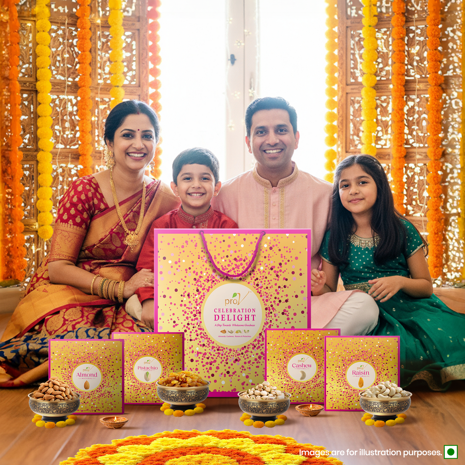 ProV Celebration Delight 300g gives you a thoughtfully curated assortment of almonds, cashews, raisins, and roasted & salted pistachios in premium packaging—at a price that’s affordable for every celebration.