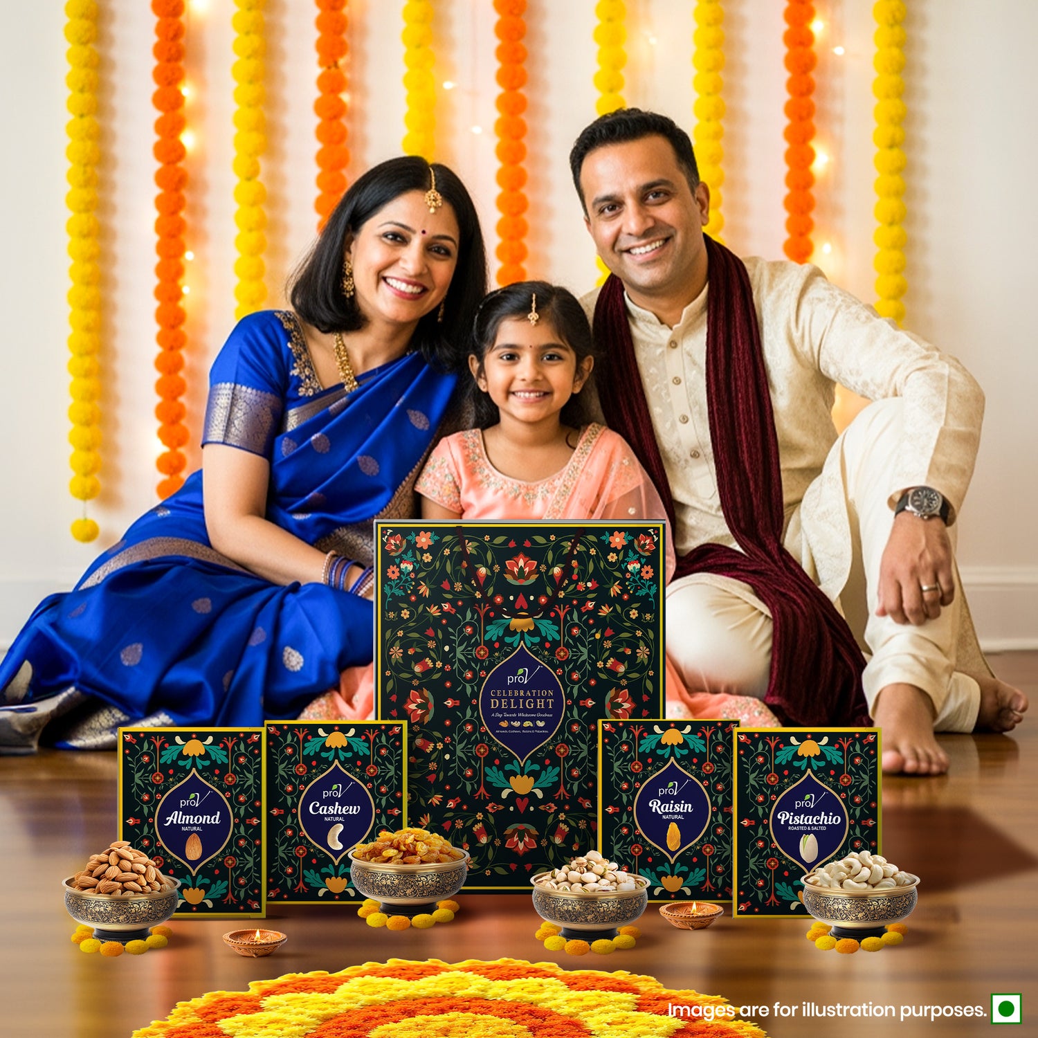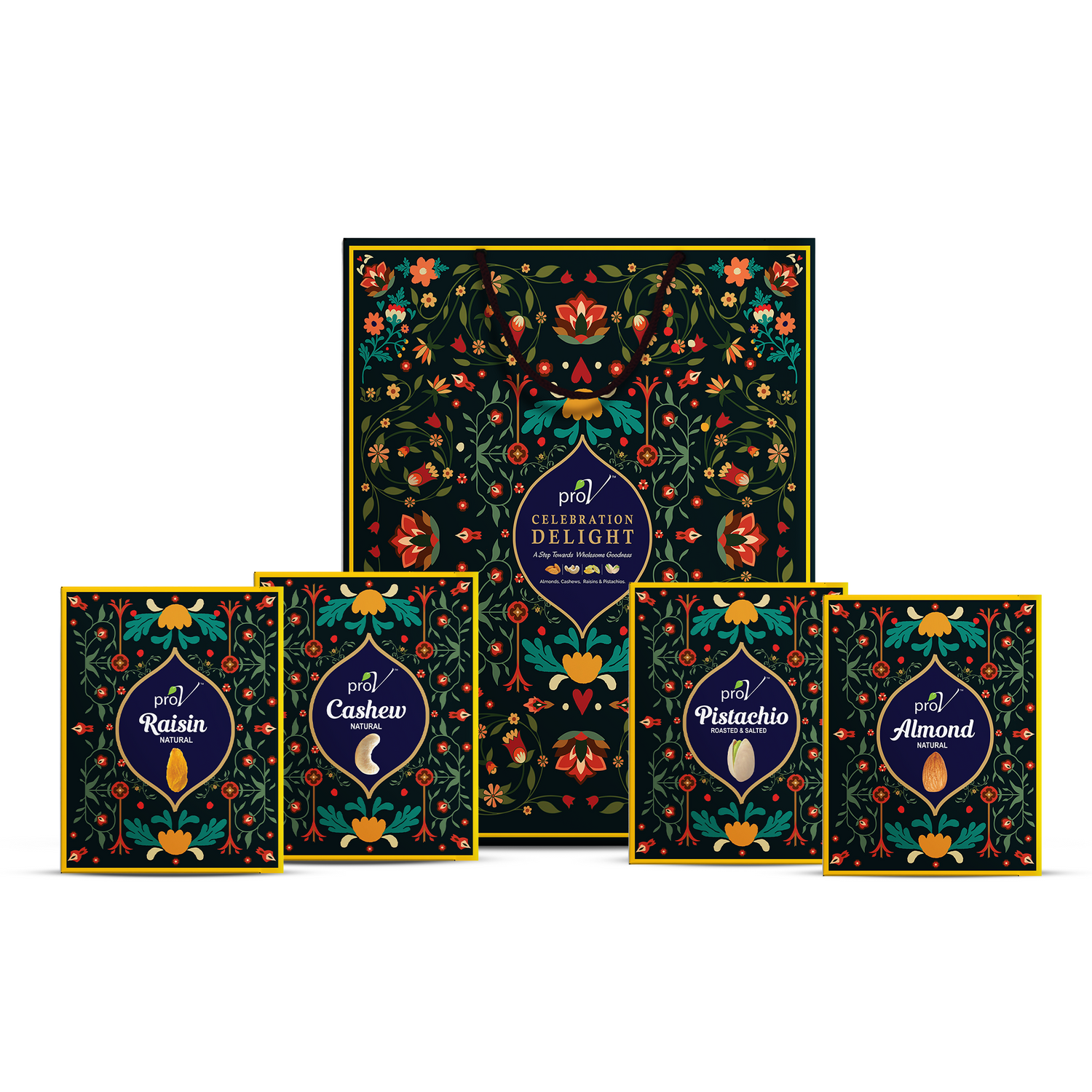 Celebrate the spirit of the season with ProV Celebration Delight, a thoughtfully curated box featuring four festive essentials – Almonds, Raisins, Cashews, and Roasted & Salted Pistachios. Each dry fruit is packed in a separate inner box, carefully arranged in a sturdy corrugated tray for a well-organized, gift-ready presentation.
