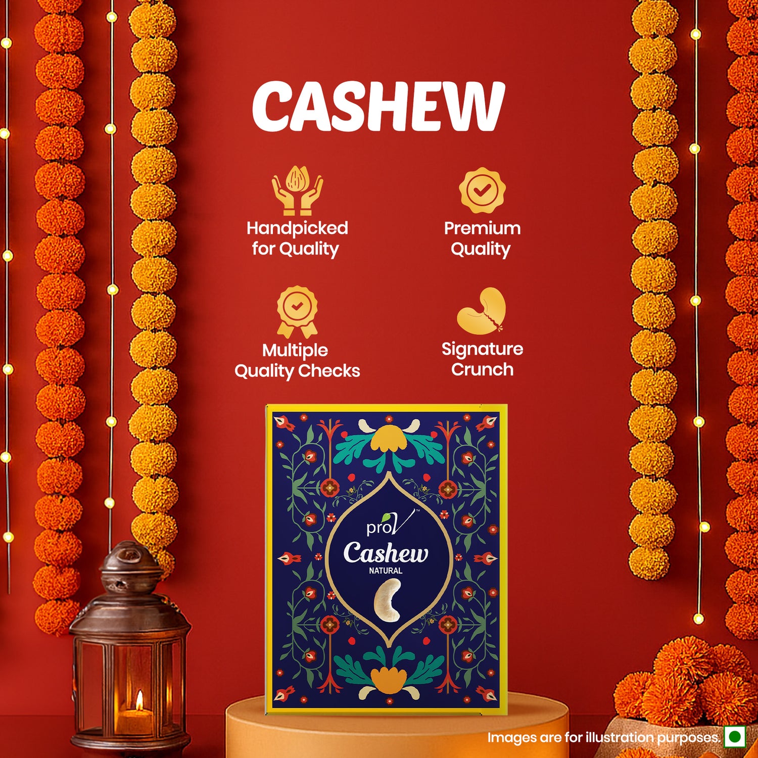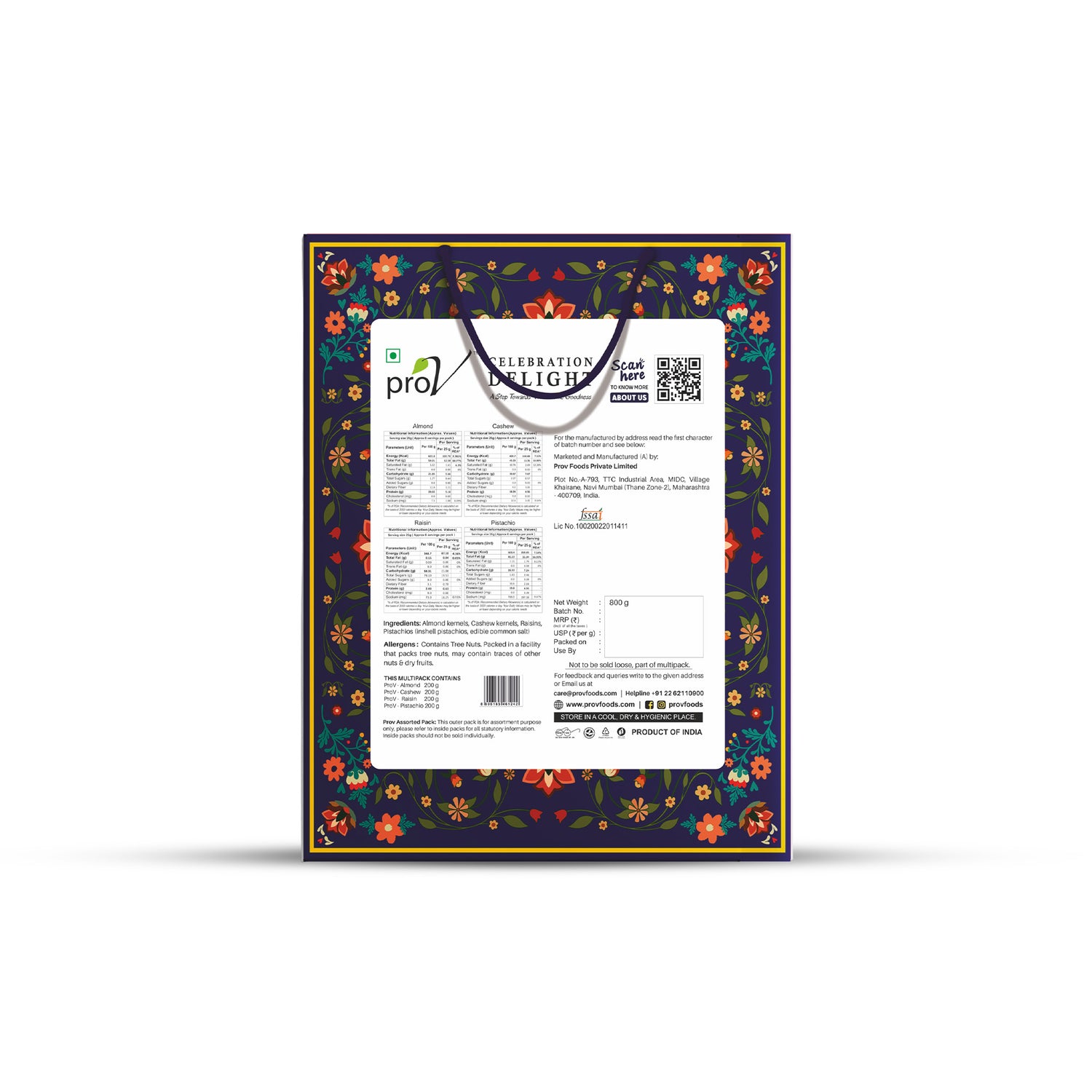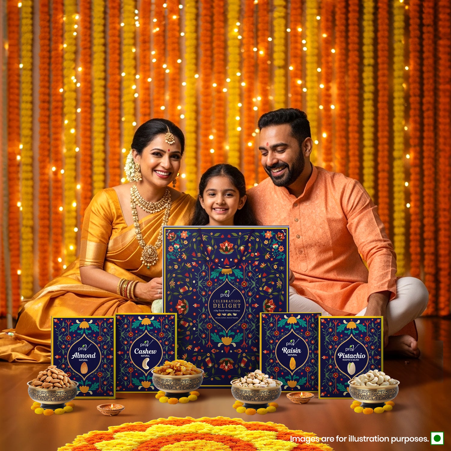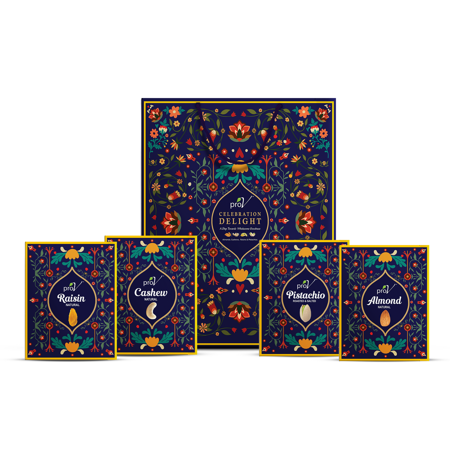 Celebrate the spirit of the season with ProV Celebration Delight, a thoughtfully curated box featuring four festive essentials – Almonds, Raisins, Cashews, and Roasted & Salted Pistachios. Each dry fruit is packed in a separate inner box, carefully arranged in a sturdy corrugated tray for a well-organized, gift-ready presentation.