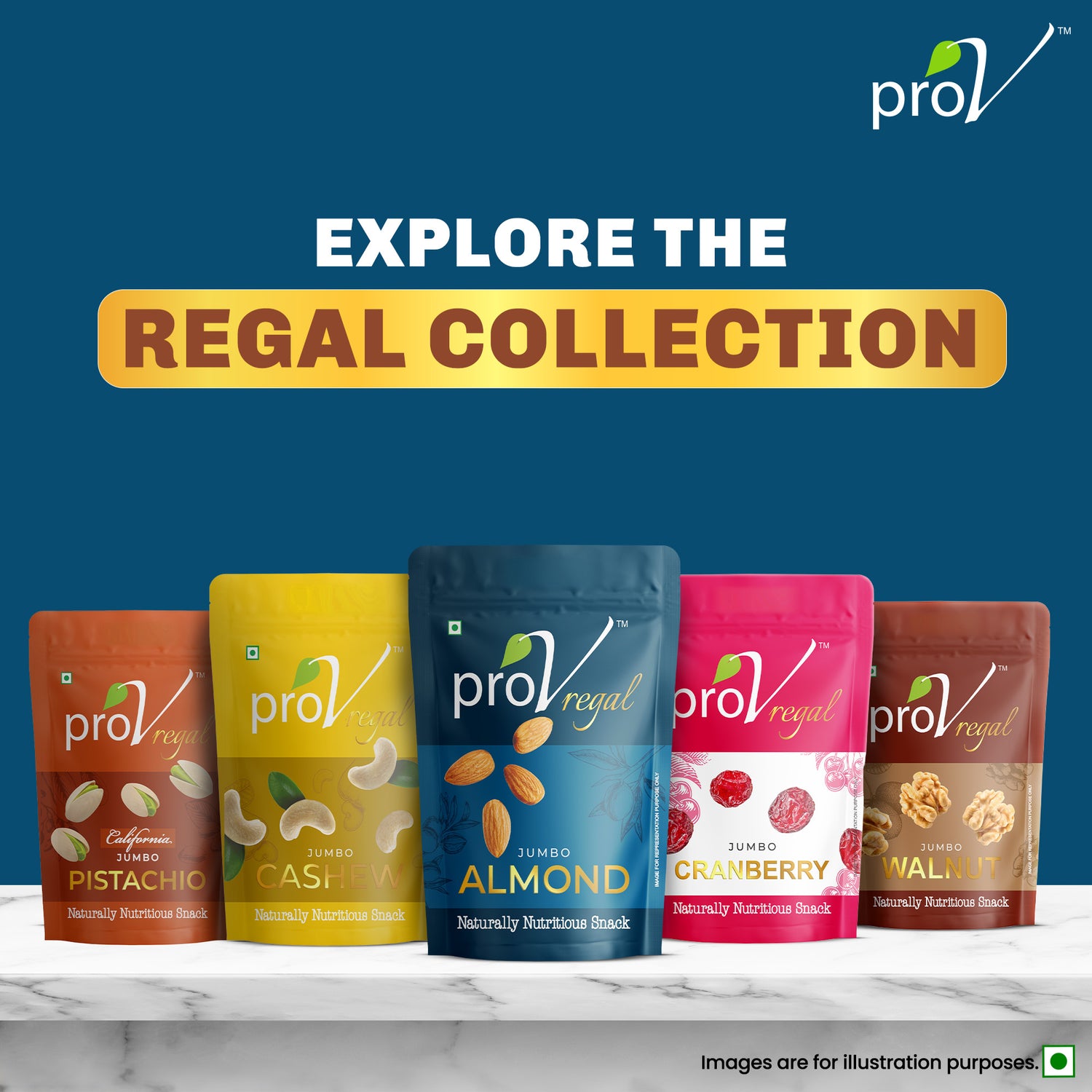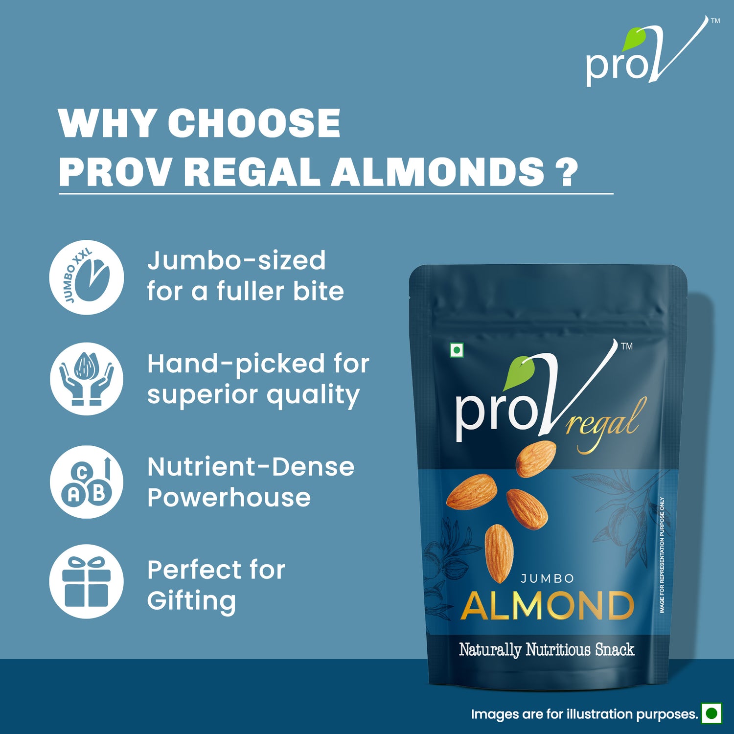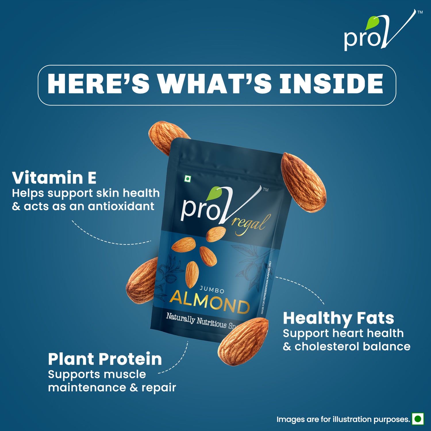 Almonds are packed with vitamins minerals protein and fiber. With a bag of ProV Regal Almonds you get your hands on just the JUMBO size of natural almonds - visually more robust nuts - natures nutrition packed in a crunchy snack.
