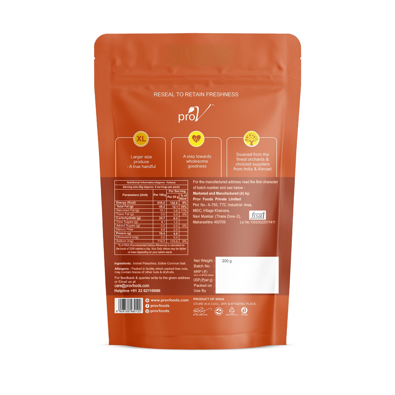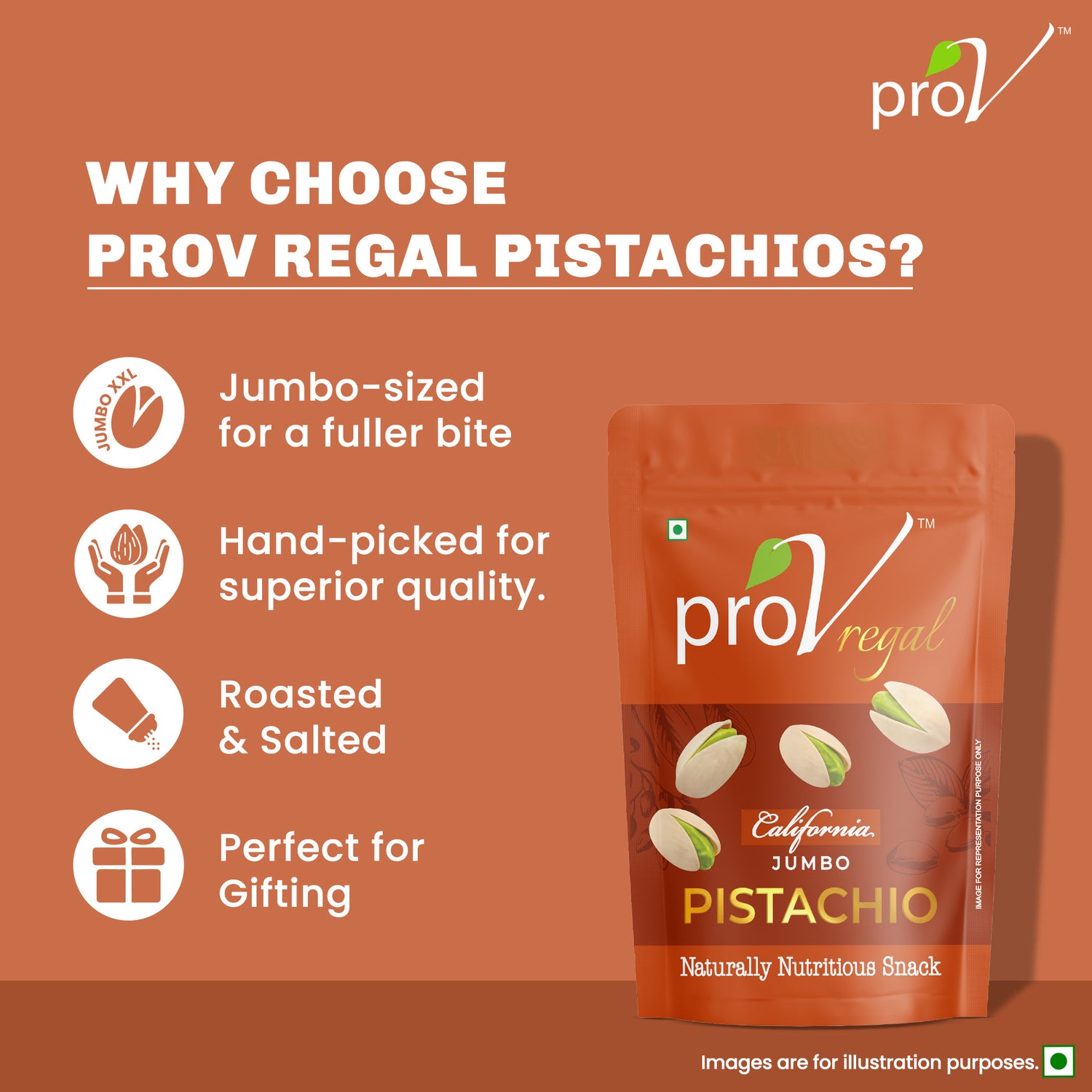 With ProV Regal Pistachio (California ) You get JUMBO sized slightly rounder pistachio packed with all the nutrients - roasted and lightly salted.